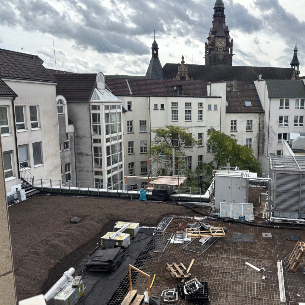 Auf den Dächern der Rathaus Galerie tut sich Großes: Insgesamt 3.000 m² Dachgartenfläche, verteilt auf drei Ebenen, verwandeln das Gebäude nach und nach in eine grüne Oase mitten in der Stadt. Elf großzügige Hochbeete und beeindruckende 430 m³ Pflanzsubstrat bilden die Grundlage für ein lebendiges, nachhaltiges Grün, das künftig zum Entspannen und Verweilen einlädt. Wo früher grauer Beton dominierte, entsteht jetzt ein naturnaher Rückzugsort: Die renommierte Wuppertaler Gärtnerei Leonhards übernimmt die Gestaltung der Dachflächen und schafft abwechslungsreiche Bereiche mit Grünflächen, einer Spielfläche und gemütlichen Aufenthaltszonen.